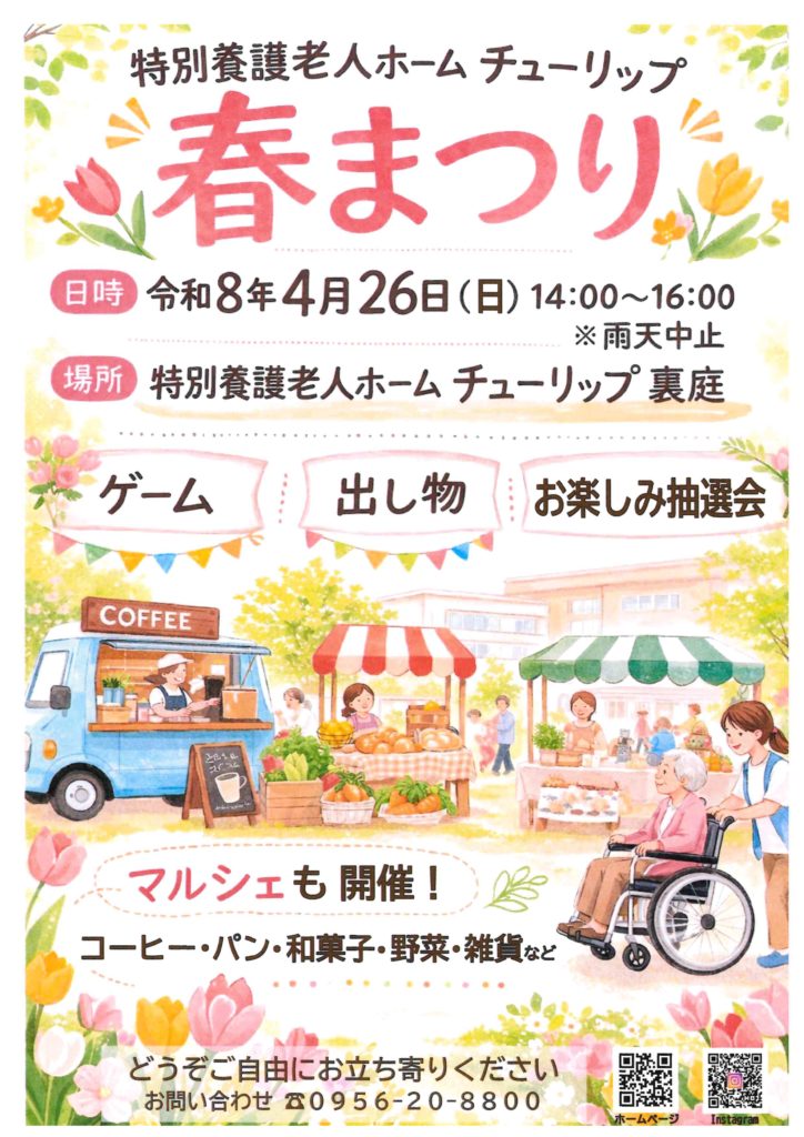 「チューリップ春祭り」のお知らせ 入居者様やご家族様、地域の皆様に楽しんでいただきたく、春のイベントを初開催いたします。 どなたでも、ご自由にご参加下さい。 日時:令和8年4月26日(日曜日)14:00~16:00(雨天中止) 場所:特別養護老人ホーム チューリップ 裏庭 内容:出し物 ゲーム お楽しみ抽選会 マルシェ開催(コーヒー・パン・和菓子・野菜・雑貨等) 注意:感染対策としてマスク着用をお願いします。症状のある方はご遠慮下さい。